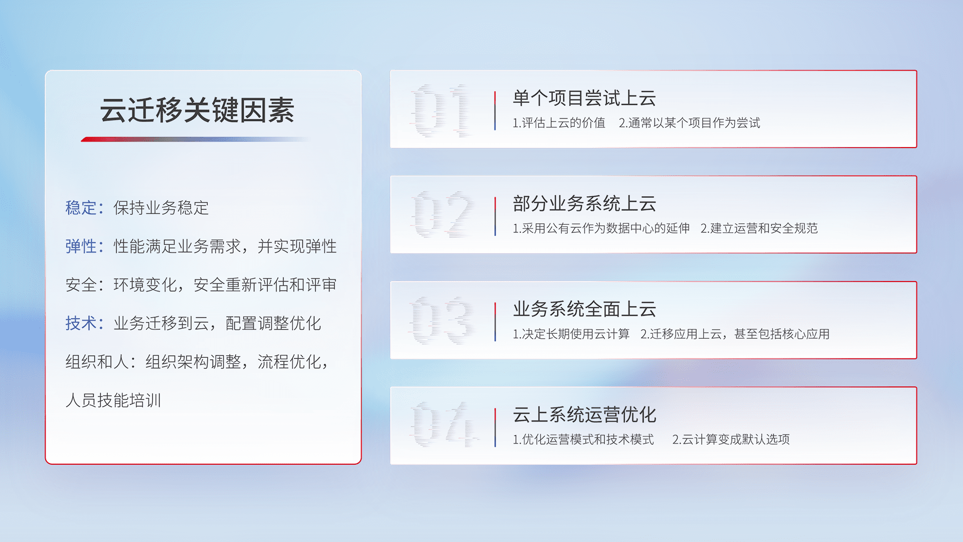 结合实际业务,,,,从规划设计、、云平台选型、、、、云原生改造、、数据迁移、、、集成交付,,,迁移全过程为客户识别最佳上云路径,,,做好风险识别管理,,,设计网络架构、、身份权限、、安全审计合规、、、、操作审计、、、、日志审计、、、监控告警策略、、、多站点容灾设计等,,,对云上基础设施进行整体规划,,提升IT治理水平,,,,以满足弹性、、高可用、、、、高性能的需求。。