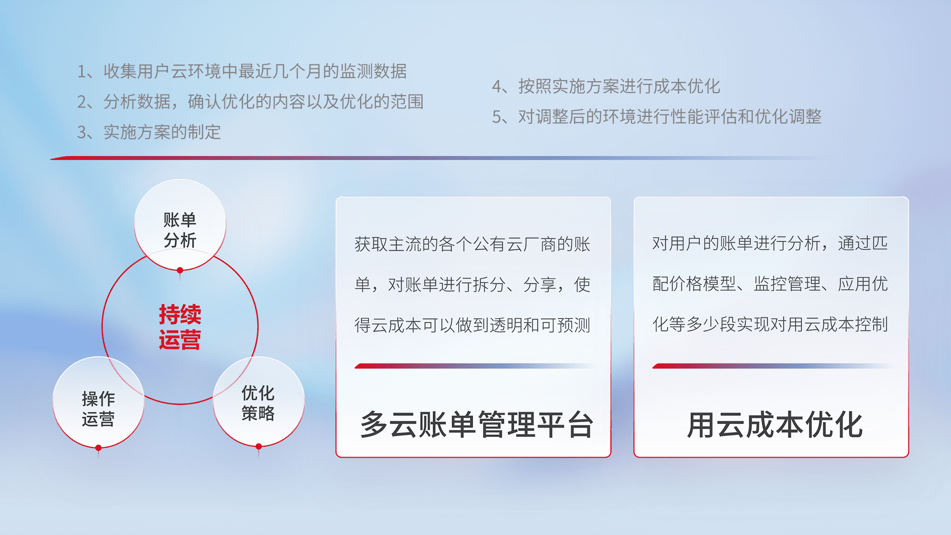 通过多云纳管,,以统一的资源数据模型把客户的云资源进行抽象和封装,,进而实现对多云资源的统一操作,,,保障云资源管理的可靠性、、、、稳定性与可用性。。量身定制化运维内容,,,配置、、、开发运维、、、补丁管理、、备份、、、监控、、、、认证和访问管理、、审计和日常巡检等,,保障在用云过程中的可靠度,,,稳定度以及高可用率。。。。